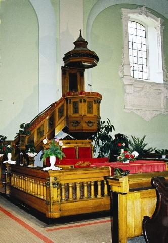 Tavanul şi ferestrele sunt decorate cu stucaturi, realizate după cel de al doilea război mondial, când au fost înfiinţate şi uşile laterale. În biserică se păstrează clopotul vechi al oraşului realizat la Prešov (Eperjes) în 1633. În turnul bisericii există în total trei clopote, realizate în 1927, 1972 şi 1980. (TSz).